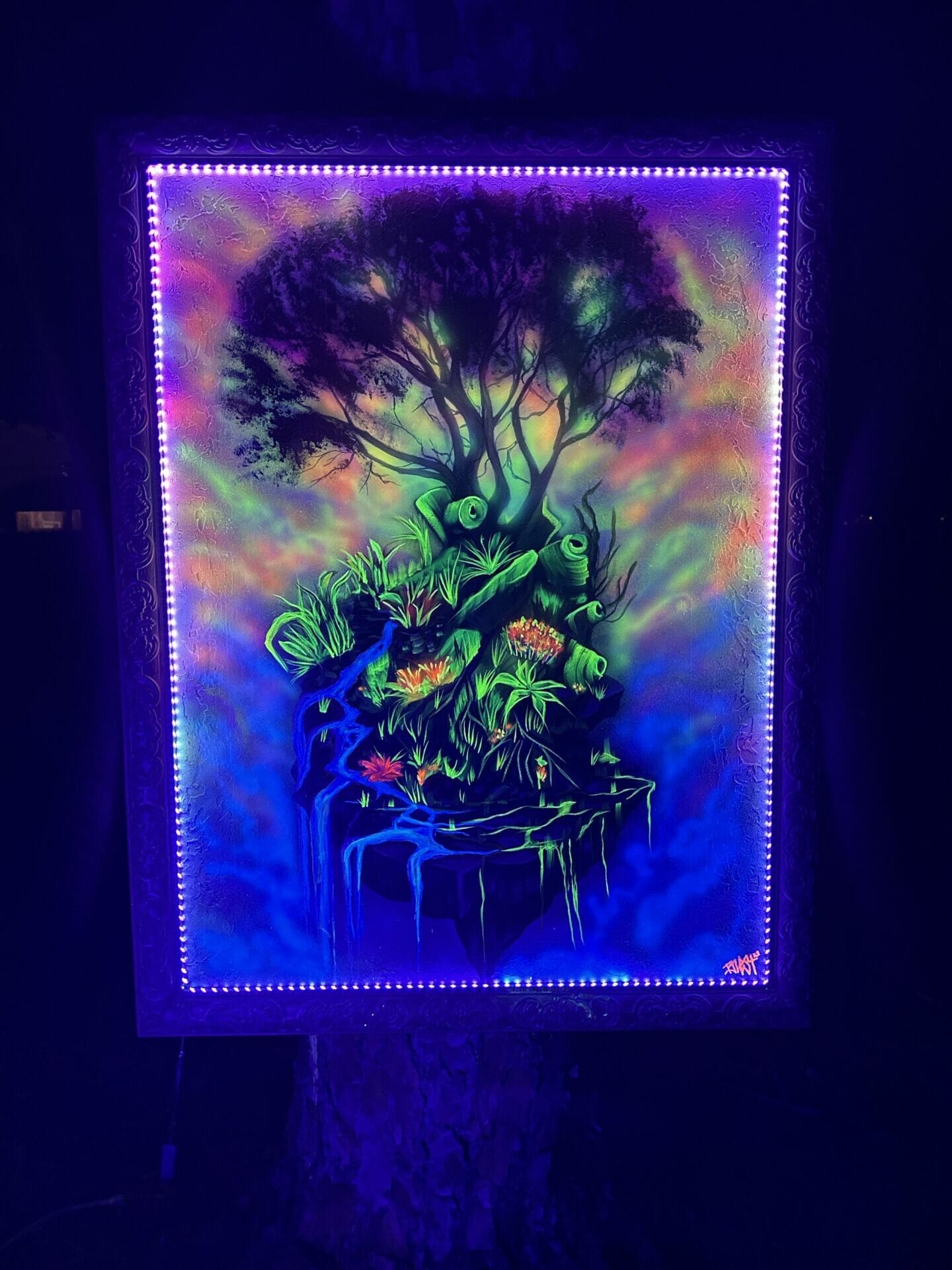 Mixed media on 42x54 in framed canvas. Black lights installed in frame and comes with separate black light spotlight. Discount if your local