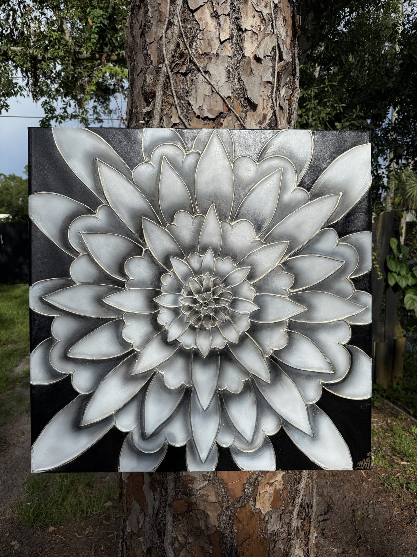 3D Magnolia flower textured raised molding paste to create it then acrylic airbrush and gold leaf marker to finish it off. Can be framed upon request. 30 x 30 in