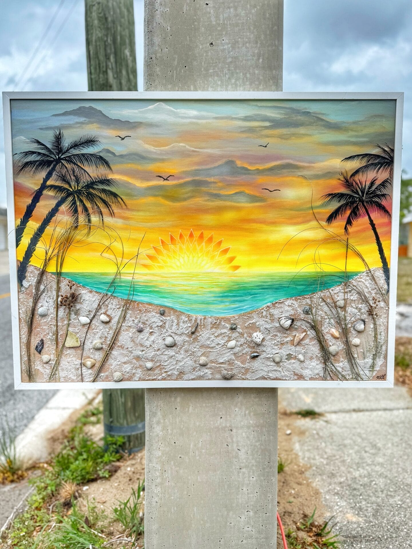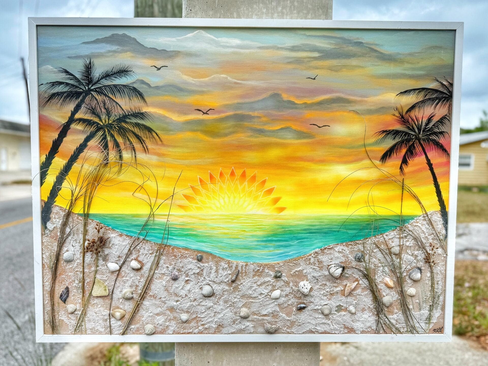 Mixed media painting with real siesta key sand, shells, and dune grass added to it with a custom frame. 30x40 in canvas with a 1 in frame