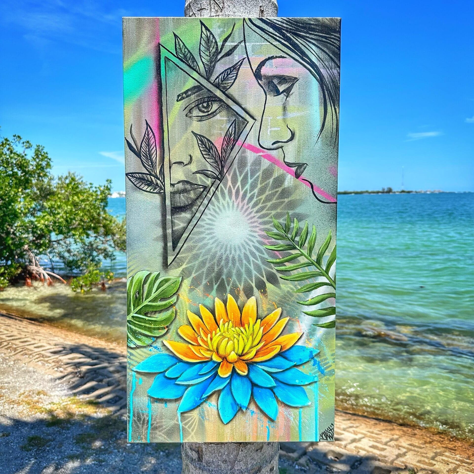 Mixed media on thick 15x30 in gallery wrapped canvas. Can be custom framed upon request.