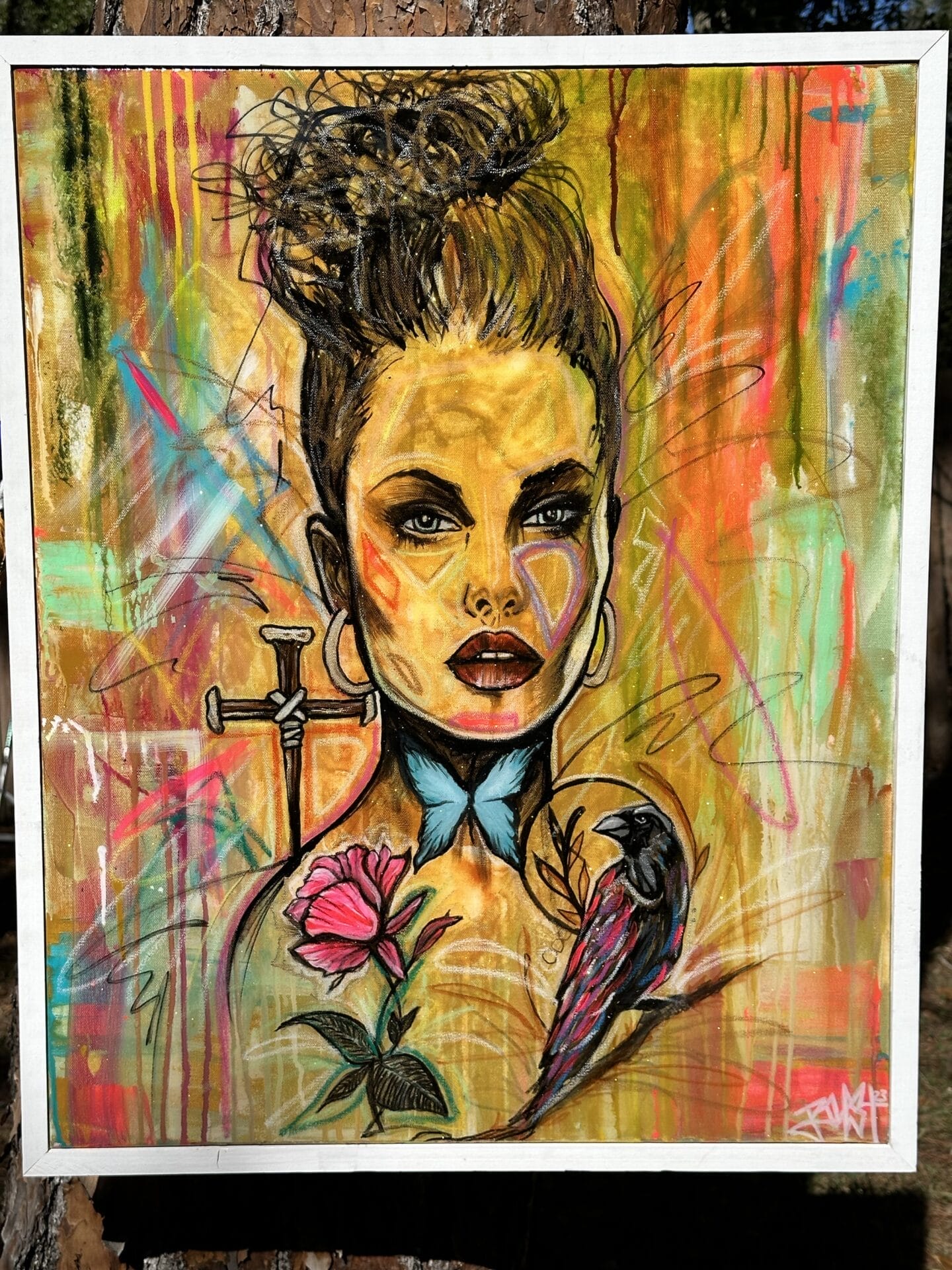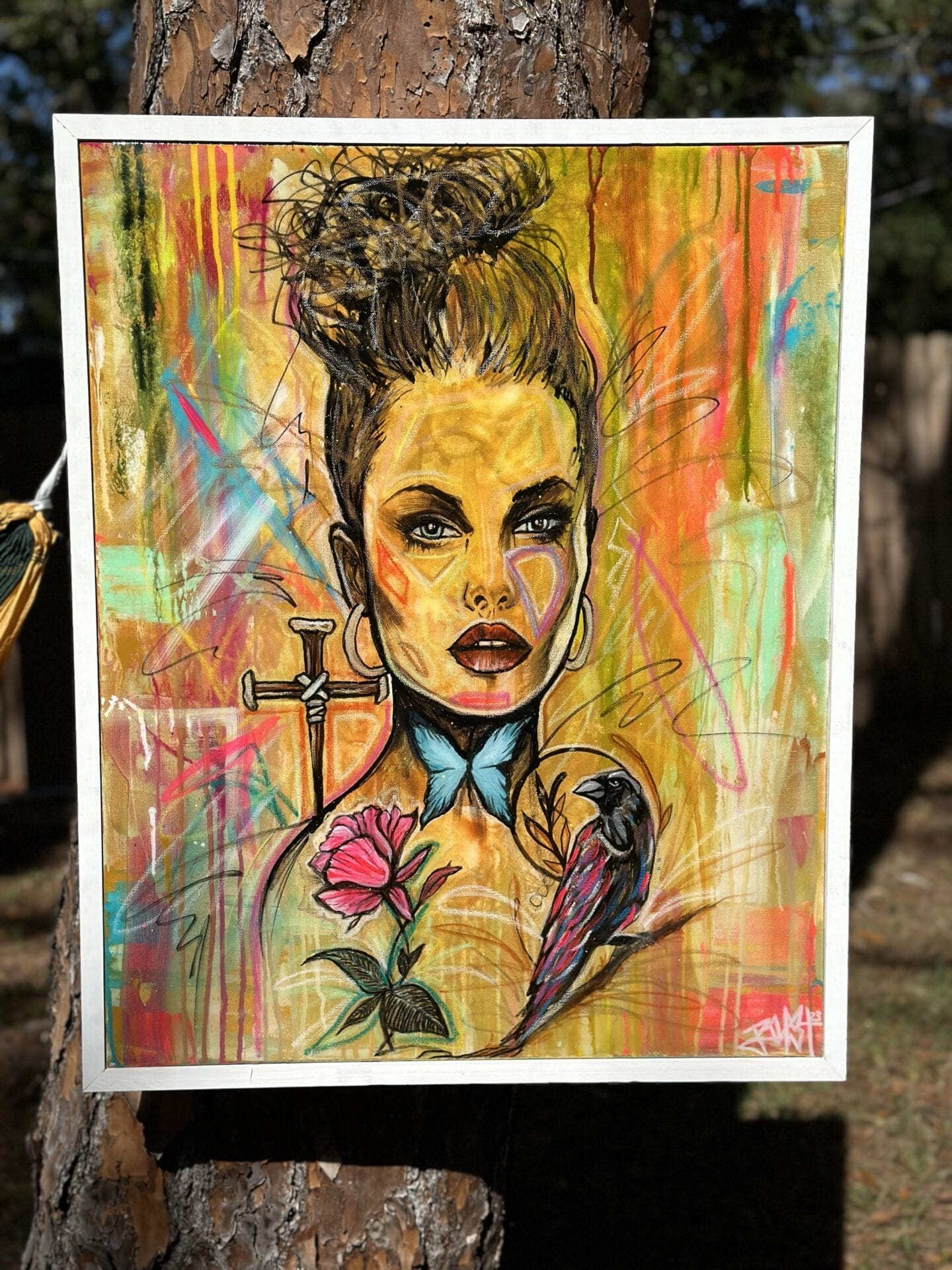 Mixed media on canvas with resin finish and custom frame 25.5 in x 31.5