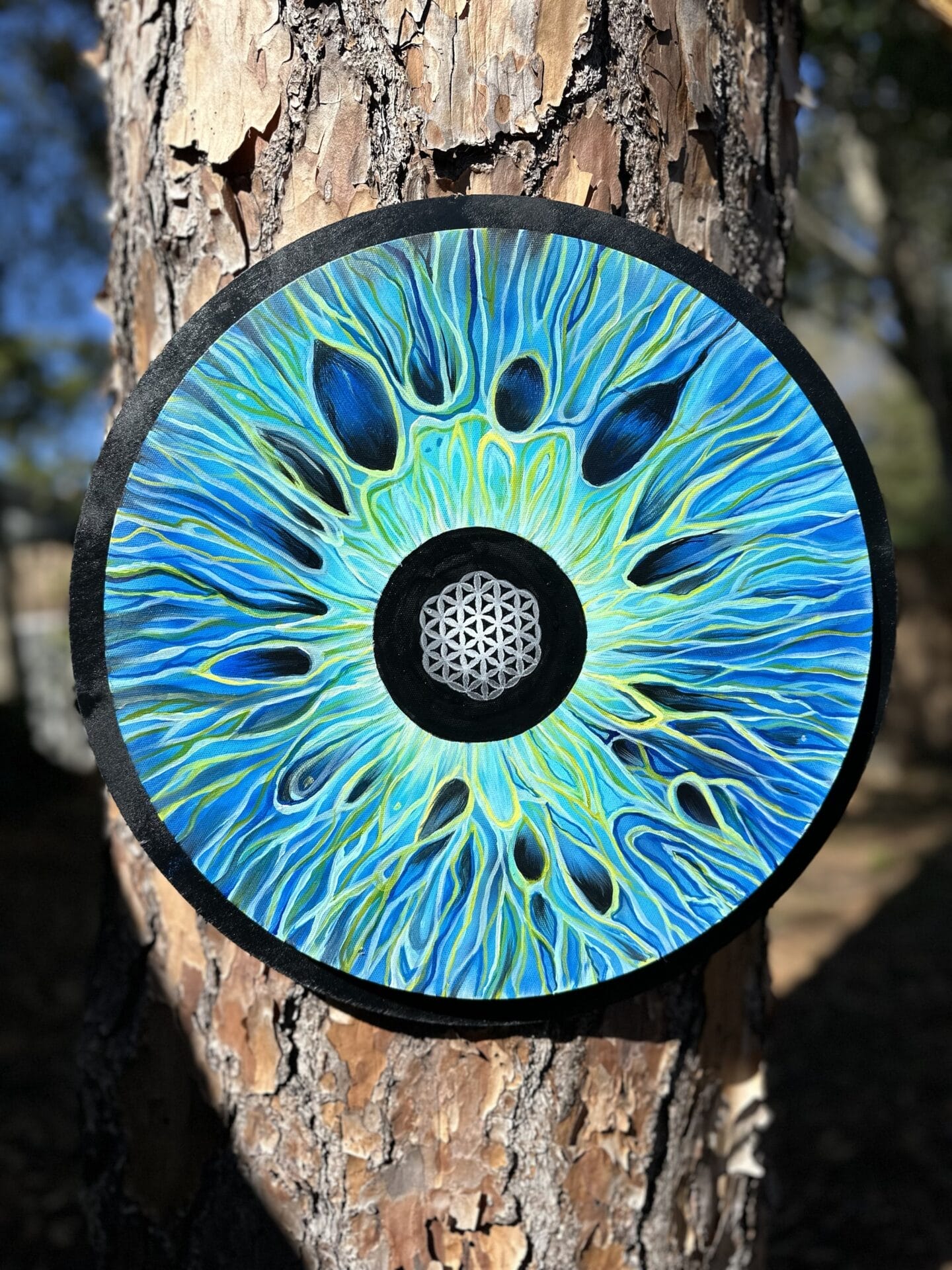 Acrylic & airbrush on 16 in circle canvas mounted in 18 in wood circle