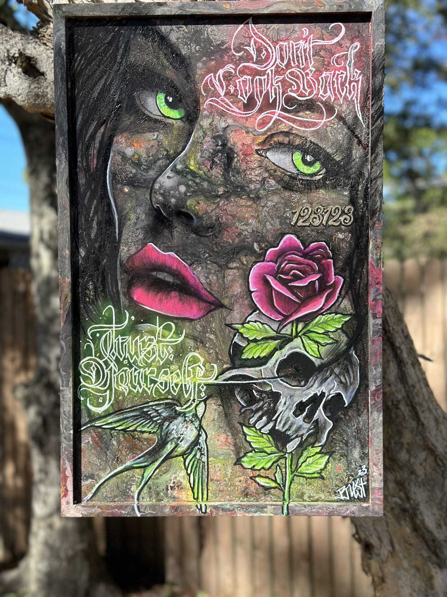 This is a mixed media on wood piece 17.5 in by 27 in. Magical when a black light is added to it at night.